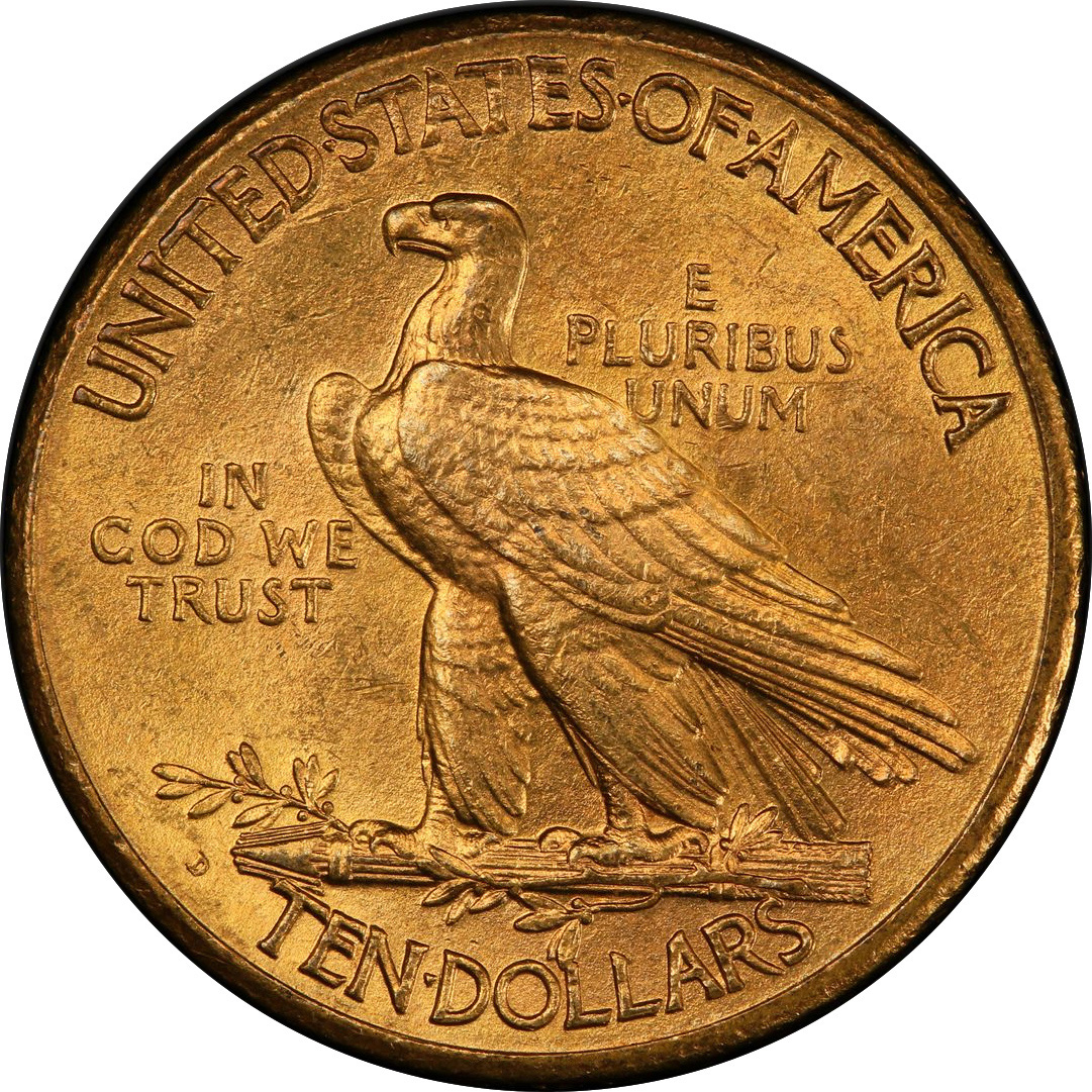 The bust on the new eagle was almost identical to the Nike head (Victory) that Saint Gaudens designed for Sherman’s monument in New York’s Central Park. At Roosevelt’s insistence, she shed her laurel crown for a handsome, but historically impossible Indian feathered war bonnet. LIBERTY was inscribed on the Indian’s headdress, with 13 stars above the head and the date below. The reverse’s eagle stands on a bundle of arrows, with the motto E PLURIBUS UNUM to the right. Encircling the periphery above the eagle is the legend UNITED STATES OF AMERICA. Below is the denomination TEN DOLLARS.