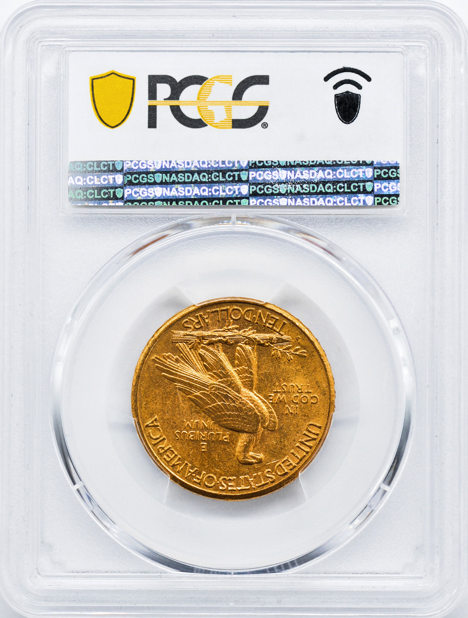 Lower relief than that demanded for Saint-Gaudens’ controversial high relief double eagle made it possible to begin minting the new $10 coins in 1907. First to be struck were the “Wire Edge” pieces, without the raised rim traditionally on U.S. coins. Five hundred were made, with 46 raised stars on their edges—symbolizing the 46 states—along with one plain-edge satin proof. These all bore triangular “periods” in legend and motto. The wire edge proved impractical, however, since the coins would not stack. Next, 31,550 pieces were struck retaining the triangular periods, but both sides were protected by a “Rolled Edge”—the sharply raised rims ordinarily used. Unfortunately, this change resulted in unsatisfactory striking quality. Rather than release these coins to possible public criticism, officials decided to melt all but 42 pieces. Ironically, this coin was intended for circulation, and although never officially released, it is considered a business strike—not a pattern.