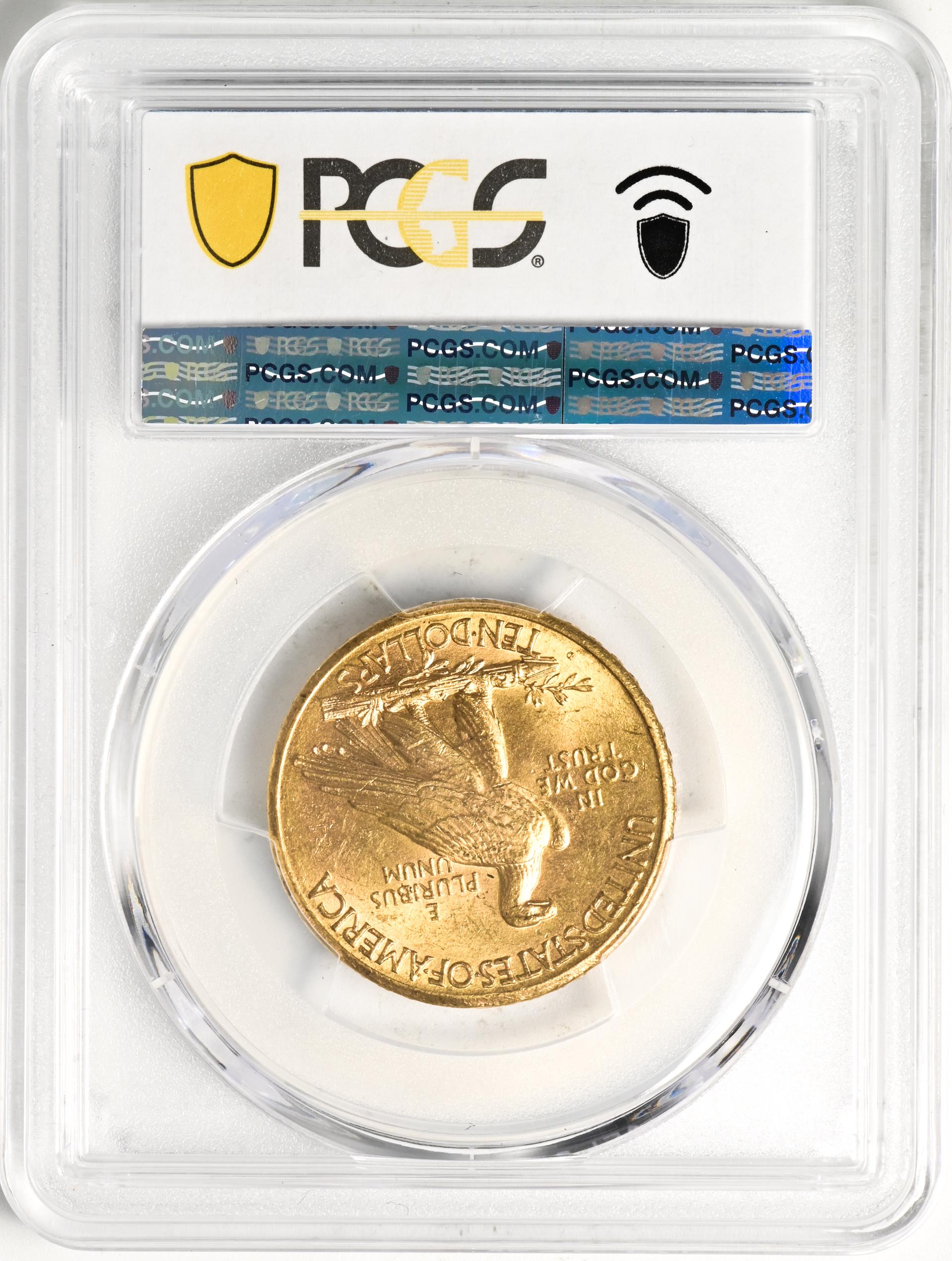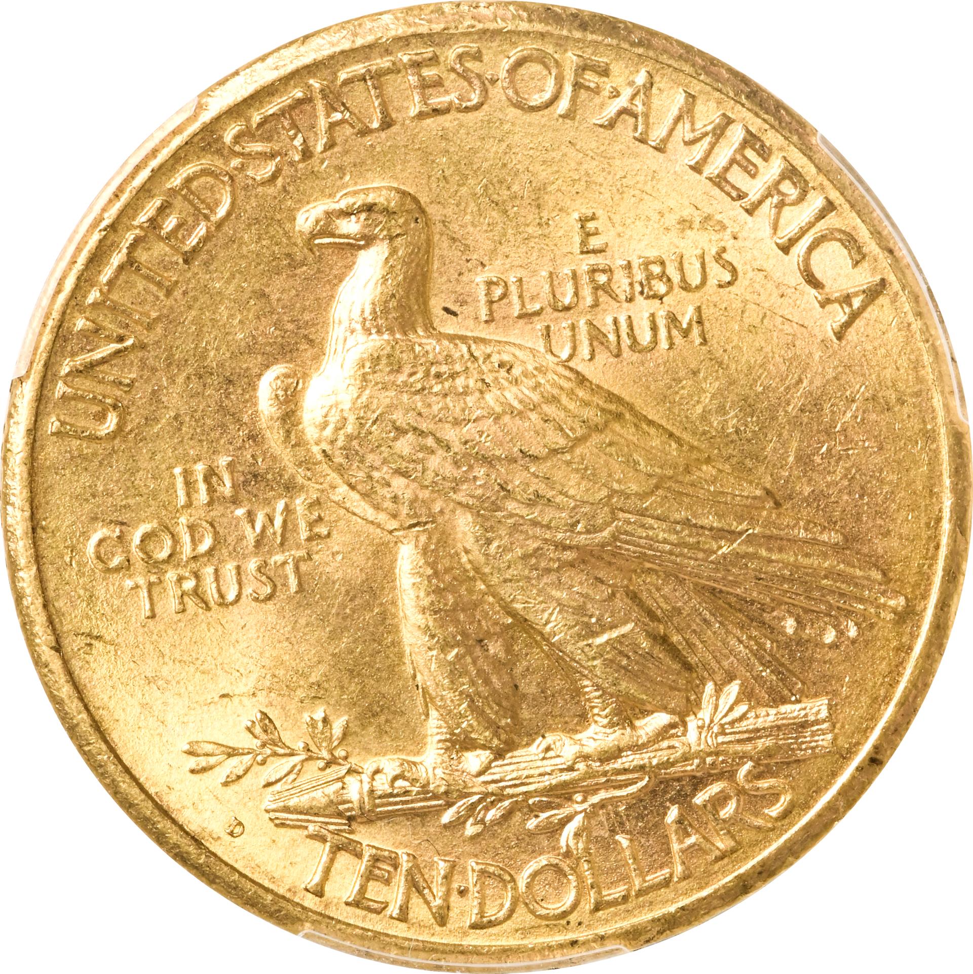 The bust on the new eagle was almost identical to the Nike head (Victory) that Saint Gaudens designed for Sherman’s monument in New York’s Central Park. At Roosevelt’s insistence, she shed her laurel crown for a handsome, but historically impossible Indian feathered war bonnet. LIBERTY was inscribed on the Indian’s headdress, with 13 stars above the head and the date below. The reverse’s eagle stands on a bundle of arrows, with the motto E PLURIBUS UNUM to the right. Encircling the periphery above the eagle is the legend UNITED STATES OF AMERICA. Below is the denomination TEN DOLLARS.