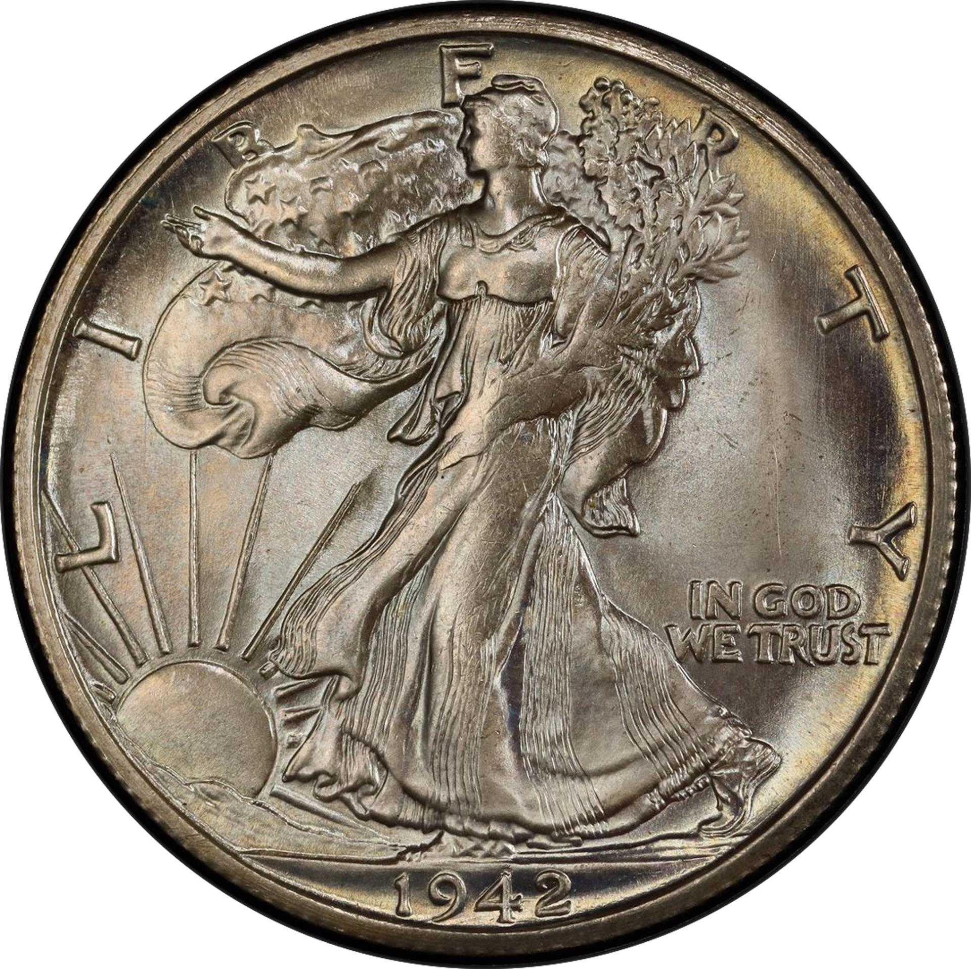 Mintages were particularly low in 1921, and the P, D and S half dollars from that year all rank among the major keys of the series. Other scarce issues include the 1916, 1916-S, 1917-D and S (with the mintmarks on the obverse) and 1938-D. Brilliant proofs were minted from 1936 to 1942, totaling 74,400 pieces, and a very few satin-finish proofs were struck in 1916 and ‘17.
